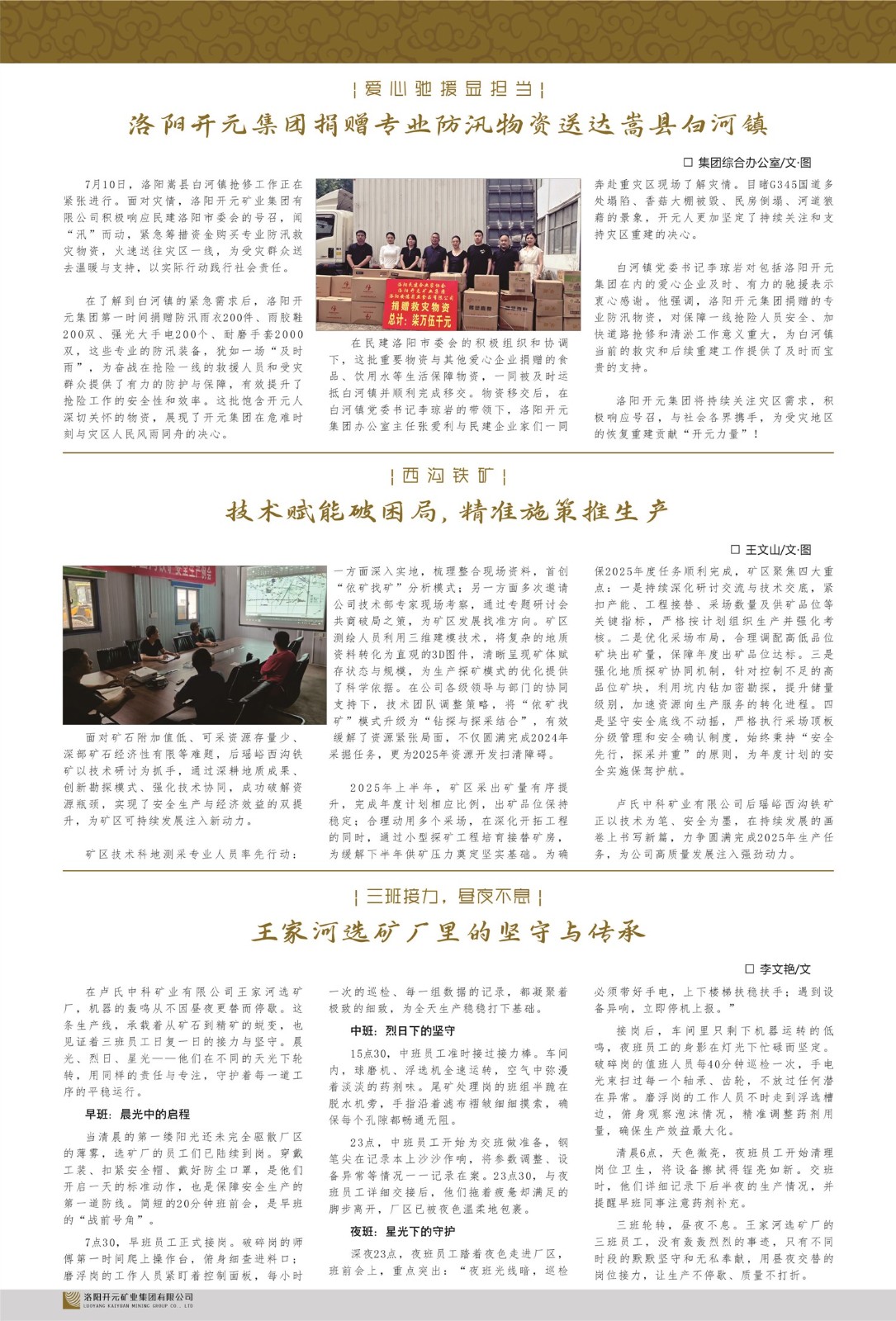 洛陽開元礦業(yè)集團有限公司簡介洛陽開元礦業(yè)集團有限公司,始成立于2006年,位于洛陽市開元大道269號。集團旗下共有十余家全資子公司,業(yè)務(wù)涉及有色金屬礦山開發(fā)、礦產(chǎn)品購銷與進出口貿(mào)易、房地產(chǎn)開發(fā)、文化藝術(shù)、企業(yè)管理與咨詢、資本投資等多個領(lǐng)域。2024年,集團公司銷售總額達7.8億元。民建河南省委委員、民建河南省委企業(yè)委副主任、民建洛陽市委委員、企業(yè)委主任、洛陽民建企業(yè)家協(xié)會會長許明月是公司創(chuàng)始人,現(xiàn)任洛陽開元礦業(yè)集團有限公司董事長。在礦業(yè)領(lǐng)域,洛陽開元礦業(yè)集團擁有多家實力雄厚的子公司:貴州開元礦業(yè)有限公司探、采礦權(quán)面積共11.33平方公里;興??h銅鑫礦業(yè)有限公司探礦權(quán)面積8.76平方公里,礦山資源潛力巨大;2021年,開元集團與盧氏中科礦業(yè)有限公司開展戰(zhàn)略合作。盧氏中科礦業(yè)有限公司專注于有色金屬的浮選、加工和銷售,擁有強大的技術(shù)支撐平臺,是集探、采、選、冶、研為一體的中大型綜合礦業(yè)企業(yè)。目前,盧氏中科王家河1000噸選礦廠已成功投產(chǎn),雙河金礦、柳關(guān)欒盧鉛鋅礦相繼順利開工,樓房銀礦與圪老灣鉛鋅礦的深部探礦重大突破,標志著礦山版圖取得重大進展,為開元集團后續(xù)發(fā)展奠定了堅實基礎(chǔ)。在文化傳媒領(lǐng)域,洛陽市明月美術(shù)館通過豐富多樣的藝術(shù)展覽、學術(shù)研討和公共教育活動,努力打造一個集展覽、交流、教育、研究為一體的綜合性藝術(shù)平臺。此外,在金融投資領(lǐng)域,開元集團旗下的北京明峰資本管理有限公司專注于投資具有高增長潛力的優(yōu)秀企業(yè),特別是高科技、新能源、環(huán)保等新興產(chǎn)業(yè),為客戶提供個性化的資產(chǎn)配置服務(wù)。在做好企業(yè)經(jīng)營的同時,開元集團始終不忘企業(yè)的社會責任和家國情懷,以突出的愛心公益事跡,開展了一系列公益慈善活動:“民建林”公益事業(yè)通過“思源基金”“幫幫公益”線上公益平臺,與眾多愛心人士籌措資金20余萬元;資助541名貧困大學生共計270余萬元,推進“數(shù)字助力——河南AI人才培養(yǎng)”;捐款10萬元,馳援京津冀、黑龍江洪水地質(zhì)災(zāi)害……公司于2017年底被洛陽市慈善總會評為“洛陽慈善風云榜——十大愛心集體”。洛陽開元礦業(yè)集團有限公司秉承持續(xù)發(fā)展理念,憑借多年來良好的企業(yè)信譽與經(jīng)營業(yè)績,與全國多家企業(yè)建立了良好合作關(guān)系,受到社會各界的一致好評,多次榮獲“納稅標兵”“先進企業(yè)”“招商引資模范企業(yè)”等榮譽稱號。回望來時路,開元人勠力同心,以“闖”的精神和“創(chuàng)”的勁頭,一路披荊斬棘,踏過千山萬水;展望新未來,開元人凝心聚力,不執(zhí)于“舊”,無畏于“新”,秉承“勇于跨越,追求卓越”的企業(yè)精神,乘著國家高質(zhì)量發(fā)展新征程的東風,跨過高山,越過大海,向著集團多元化、國際化的目標,逐夢遠航,跨越前行!