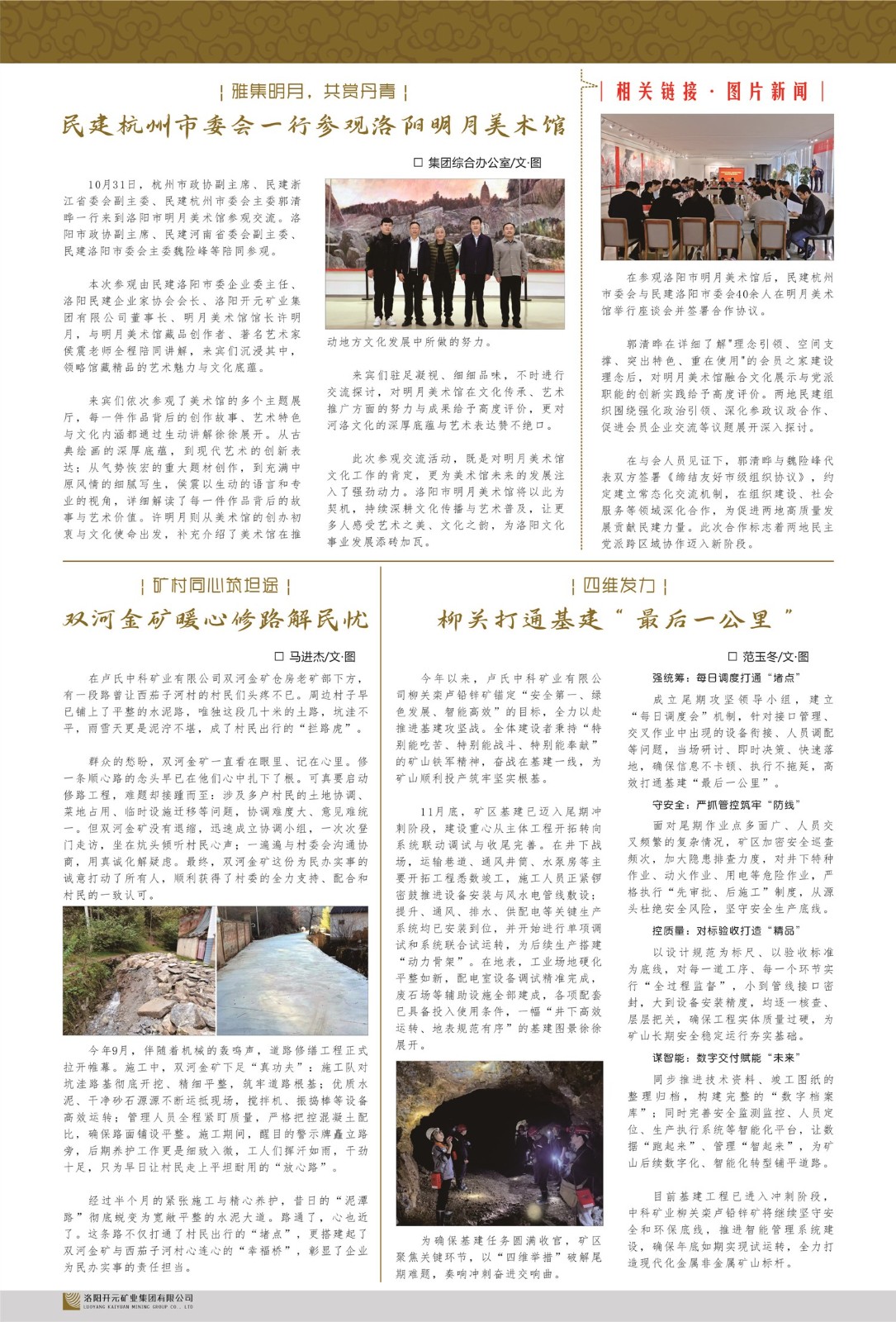 洛陽(yáng)開(kāi)元礦業(yè)集團(tuán)有限公司簡(jiǎn)介洛陽(yáng)開(kāi)元礦業(yè)集團(tuán)有限公司,始成立于2006年,位于洛陽(yáng)市開(kāi)元大道269號(hào)。集團(tuán)旗下共有十余家全資子公司,業(yè)務(wù)涉及有色金屬礦山開(kāi)發(fā)、礦產(chǎn)品購(gòu)銷(xiāo)與進(jìn)出口貿(mào)易、房地產(chǎn)開(kāi)發(fā)、文化藝術(shù)、企業(yè)管理與咨詢(xún)、資本投資等多個(gè)領(lǐng)域。民建河南省委委員、民建河南省委企業(yè)委副主任、民建洛陽(yáng)市委委員、企業(yè)委主任、洛陽(yáng)民建企業(yè)家協(xié)會(huì)會(huì)長(zhǎng)許明月是公司創(chuàng)始人,現(xiàn)任洛陽(yáng)開(kāi)元礦業(yè)集團(tuán)有限公司董事長(zhǎng)。在礦業(yè)領(lǐng)域,洛陽(yáng)開(kāi)元礦業(yè)集團(tuán)擁有多家實(shí)力雄厚的子公司:貴州開(kāi)元礦業(yè)有限公司探、采礦權(quán)面積共11.33平方公里;興海縣銅鑫礦業(yè)有限公司探礦權(quán)面積8.76平方公里,礦山資源潛力巨大;2021年,開(kāi)元集團(tuán)與盧氏中科礦業(yè)有限公司開(kāi)展戰(zhàn)略合作。盧氏中科礦業(yè)有限公司專(zhuān)注于有色金屬的浮選、加工和銷(xiāo)售,擁有強(qiáng)大的技術(shù)支撐平臺(tái),是集探、采、選、冶、研為一體的中大型綜合礦業(yè)企業(yè)。目前,盧氏中科王家河1000噸選礦廠(chǎng)已成功投產(chǎn),雙河金礦、柳關(guān)欒盧鉛鋅礦相繼順利開(kāi)工,樓房銀礦與圪老灣鉛鋅礦的深部探礦重大突破,標(biāo)志著礦山版圖取得重大進(jìn)展,為開(kāi)元集團(tuán)后續(xù)發(fā)展奠定了堅(jiān)實(shí)基礎(chǔ)。在文化傳媒領(lǐng)域,洛陽(yáng)市明月美術(shù)館通過(guò)豐富多樣的藝術(shù)展覽、學(xué)術(shù)研討和公共教育活動(dòng),努力打造一個(gè)集展覽、交流、教育、研究為一體的綜合性藝術(shù)平臺(tái)。此外,在金融投資領(lǐng)域,開(kāi)元集團(tuán)旗下的北京明峰資本管理有限公司專(zhuān)注于投資具有高增長(zhǎng)潛力的優(yōu)秀企業(yè),特別是高科技、新能源、環(huán)保等新興產(chǎn)業(yè),為客戶(hù)提供個(gè)性化的資產(chǎn)配置服務(wù)。在做好企業(yè)經(jīng)營(yíng)的同時(shí),開(kāi)元集團(tuán)始終不忘企業(yè)的社會(huì)責(zé)任和家國(guó)情懷,以突出的愛(ài)心公益事跡,開(kāi)展了一系列公益慈善活動(dòng):“民建林”公益事業(yè)通過(guò)“思源基金”“幫幫公益”線(xiàn)上公益平臺(tái),與眾多愛(ài)心人士籌措資金20余萬(wàn)元;資助541名貧困大學(xué)生共計(jì)270余萬(wàn)元,推進(jìn)“數(shù)字助力——河南AI人才培養(yǎng)”;捐款10萬(wàn)元,馳援京津冀、黑龍江洪水地質(zhì)災(zāi)害……公司于2017年底被洛陽(yáng)市慈善總會(huì)評(píng)為“洛陽(yáng)慈善風(fēng)云榜——十大愛(ài)心集體”。洛陽(yáng)開(kāi)元礦業(yè)集團(tuán)有限公司秉承持續(xù)發(fā)展理念,憑借多年來(lái)良好的企業(yè)信譽(yù)與經(jīng)營(yíng)業(yè)績(jī),與全國(guó)多家企業(yè)建立了良好合作關(guān)系,受到社會(huì)各界的一致好評(píng),多次榮獲“納稅標(biāo)兵”“先進(jìn)企業(yè)”“招商引資模范企業(yè)”等榮譽(yù)稱(chēng)號(hào)。回望來(lái)時(shí)路,開(kāi)元人勠力同心,以“闖”的精神和“創(chuàng)”的勁頭,一路披荊斬棘,踏過(guò)千山萬(wàn)水;展望新未來(lái),開(kāi)元人凝心聚力,不執(zhí)于“舊”,無(wú)畏于“新”,秉承“勇于跨越,追求卓越”的企業(yè)精神,乘著國(guó)家高質(zhì)量發(fā)展新征程的東風(fēng),跨過(guò)高山,越過(guò)大海,向著集團(tuán)多元化、國(guó)際化的目標(biāo),逐夢(mèng)遠(yuǎn)航,跨越前行!